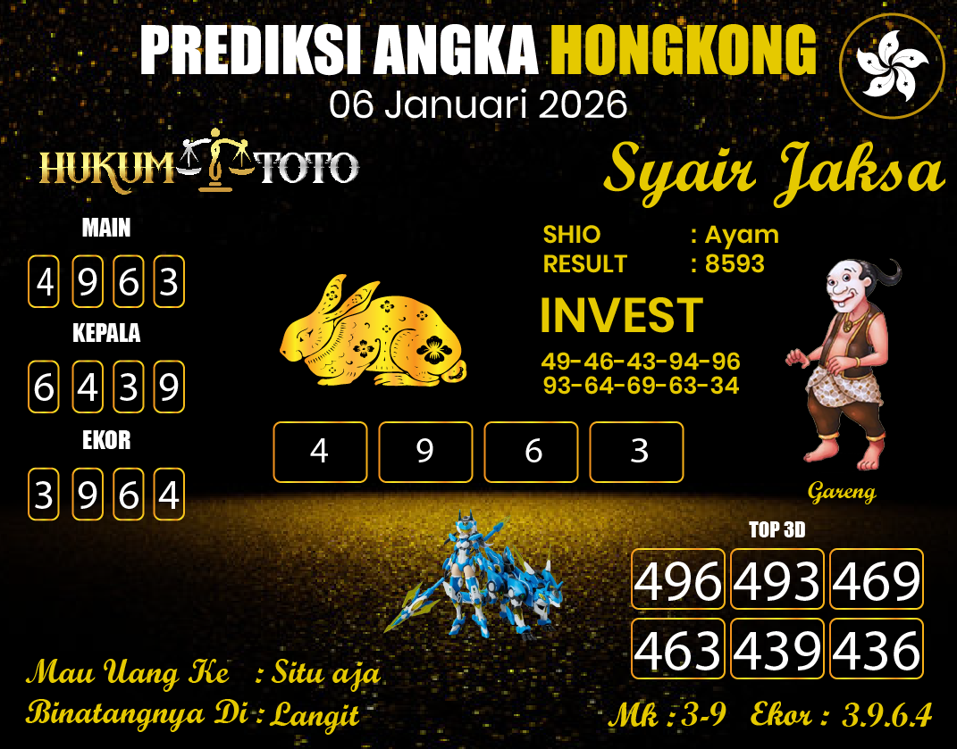 Mencari angka jitu keluaran hongkong di Prediksi HukumToto terus-menerus selalu dapat membantu banyak bettor. Lantaran, bukan cuma siapkan result togel dan prediksi togel yang komplet dari beberapa pasaran, di Prediksi HukumToto pula kalian dapat mendatangkan atau menganalisis buku mimpi togel, di mana semasing tipe mimpi yang pas abjad diartikan pada tipe angka. Baik itu buku mimpi 2D, 3D hingga sampai 4D.