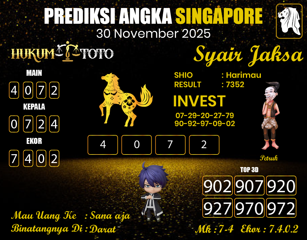 Mencari angka jitu keluaran singapore di Prediksi HukumToto terus-menerus selalu dapat membantu banyak bettor. Lantaran, bukan cuma siapkan result togel dan prediksi togel yang komplet dari beberapa pasaran, di Prediksi HukumToto pula kalian dapat mendatangkan atau menganalisis buku mimpi togel, di mana semasing tipe mimpi yang pas abjad diartikan pada tipe angka. Baik itu buku mimpi 2D, 3D hingga sampai 4D.