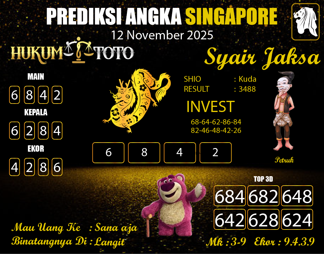 Mencari angka jitu keluaran singapore di Prediksi HukumToto terus-menerus selalu dapat membantu banyak bettor. Lantaran, bukan cuma siapkan result togel dan prediksi togel yang komplet dari beberapa pasaran, di Prediksi HukumToto pula kalian dapat mendatangkan atau menganalisis buku mimpi togel, di mana semasing tipe mimpi yang pas abjad diartikan pada tipe angka. Baik itu buku mimpi 2D, 3D hingga sampai 4D.